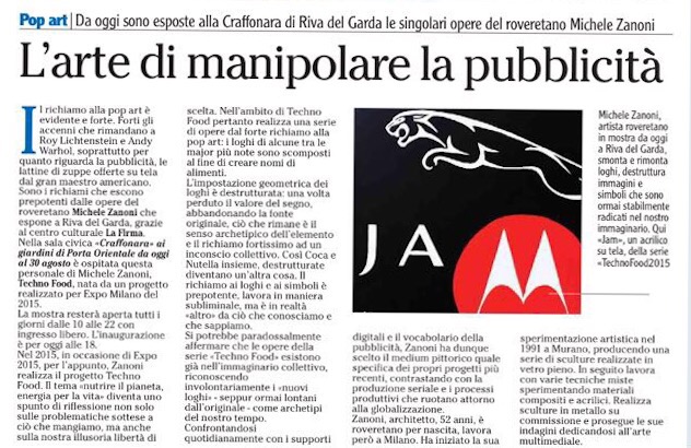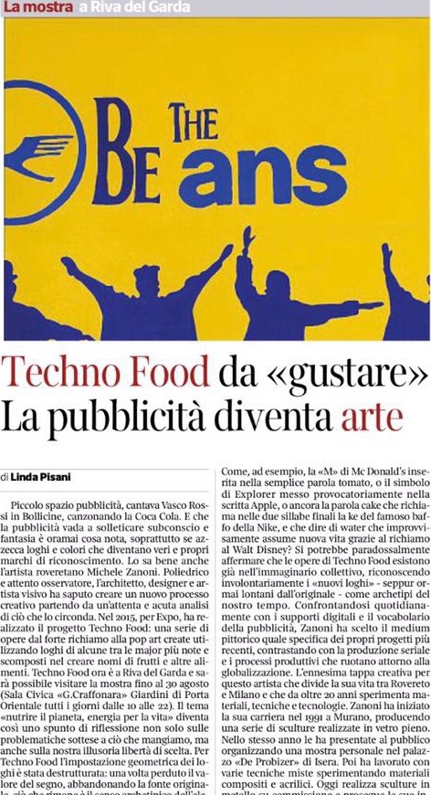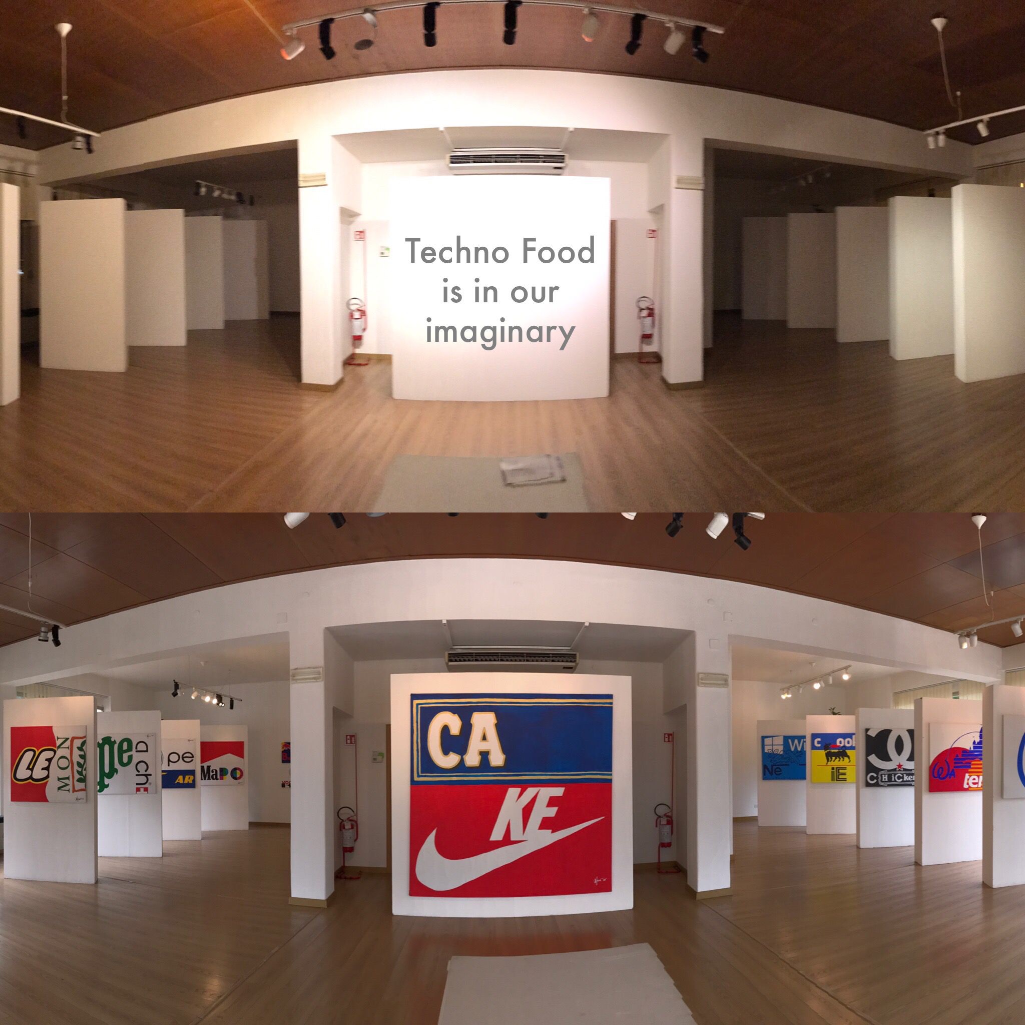 Techno Food that takes its roots from EXPO Milano 2015 and its theme “Feeding the planet, Energy for life”. It is a series of Pop Art-inspired canvases, where logos of major corporations are broken up and put together in order to produce the name of a fruit or other foods. For instance, Campari and Nike generate the word cake. What is the underlying idea? Food becomes technological through logo deconstruction. Technological food also becomes food for thought: We should reconsider both what we eat and our apparent freedom of choice. Not all of these companies deal with food, but they inevitably drive our habits and choices.