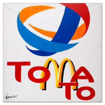 Techno-Food Projects @ Bys Milano Restaurant. In the project Techno Food food is a technological food: in a series of paintings with a strong pop aesthetic, the logo of important majors are broken up in order to create names of fruits or of other kind of food. It invites to reflect not only about food but on the whole industrial process: what we percieve as natural is indeed completely artificial.