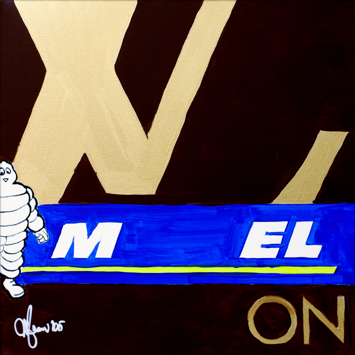 Techno Food that takes its roots from EXPO Milano 2015 and its theme “Feeding the planet, Energy for life”. It is a series of Pop Art-inspired canvases, where logos of major corporations are broken up and put together in order to produce the name of a fruit or other foods. For instance, Campari and Nike generate the word cake. What is the underlying idea? Food becomes technological through logo deconstruction. Technological food also becomes food for thought: We should reconsider both what we eat and our apparent freedom of choice. Not all of these companies deal with food, but they inevitably drive our habits and choices.