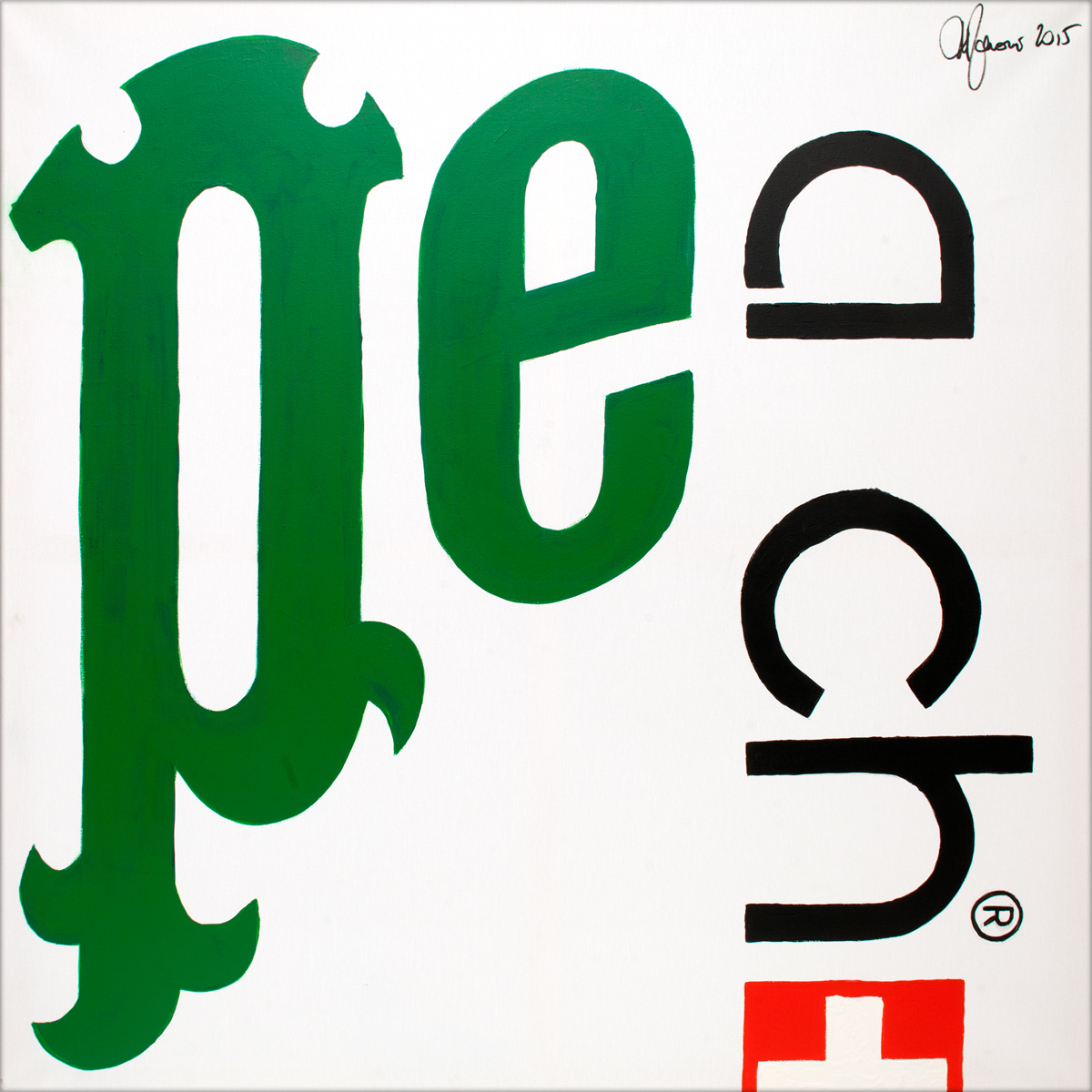 Techno Food that takes its roots from EXPO Milano 2015 and its theme “Feeding the planet, Energy for life”. It is a series of Pop Art-inspired canvases, where logos of major corporations are broken up and put together in order to produce the name of a fruit or other foods. For instance, Campari and Nike generate the word cake. What is the underlying idea? Food becomes technological through logo deconstruction. Technological food also becomes food for thought: We should reconsider both what we eat and our apparent freedom of choice. Not all of these companies deal with food, but they inevitably drive our habits and choices.