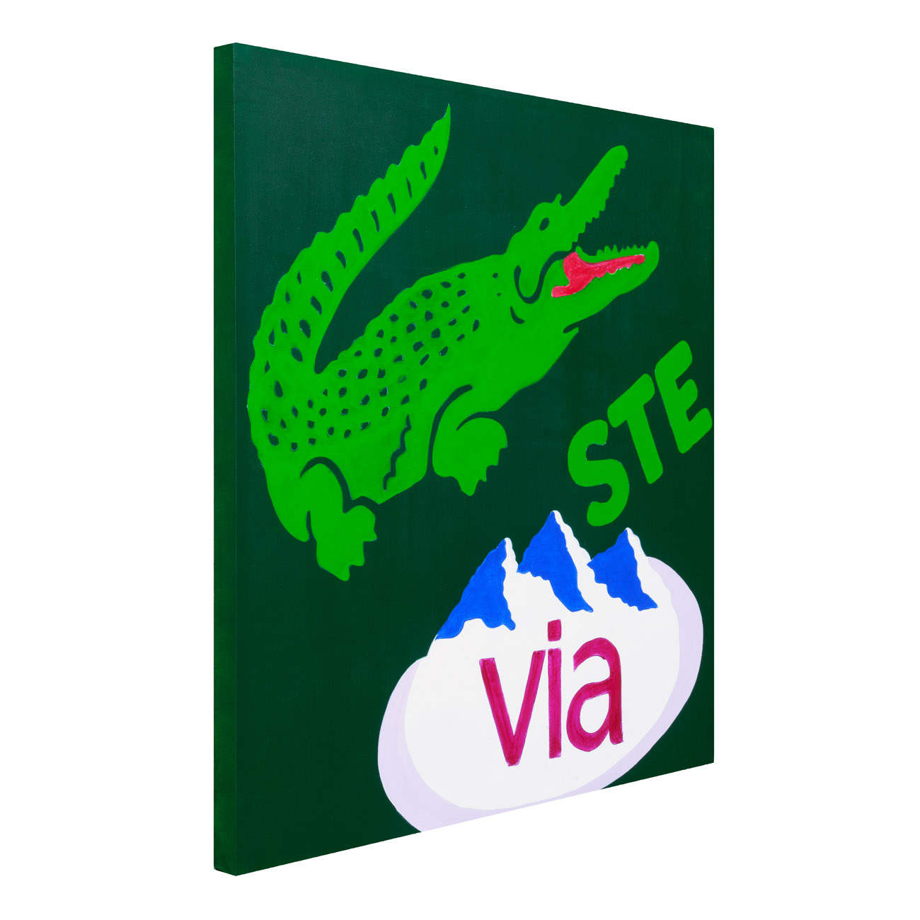 Techno Food that takes its roots from EXPO Milano 2015 and its theme “Feeding the planet, Energy for life”. It is a series of Pop Art-inspired canvases, where logos of major corporations are broken up and put together in order to produce the name of a fruit or other foods. For instance, Campari and Nike generate the word cake. What is the underlying idea? Food becomes technological through logo deconstruction. Technological food also becomes food for thought: We should reconsider both what we eat and our apparent freedom of choice. Not all of these companies deal with food, but they inevitably drive our habits and choices.
